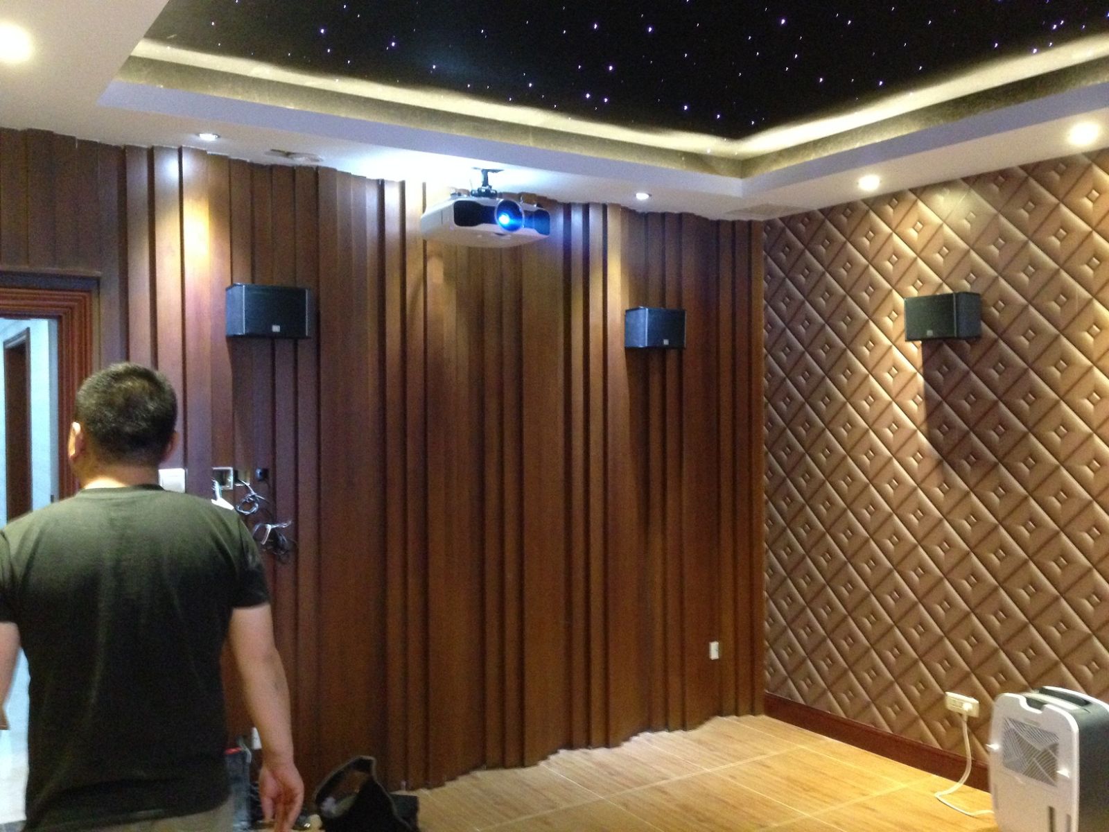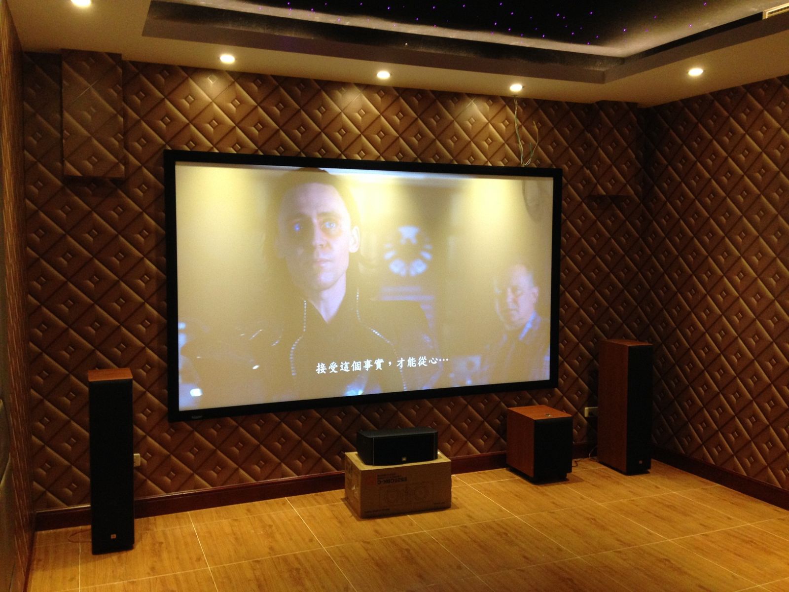 影院使用了EPSON TW8200投影机与瑞普画框银幕。音响系统为JBL E系列前置、中置音箱、超低音箱,ES系列环绕,在经过认证装修的视听室内营造出优良的7.1环绕音效。