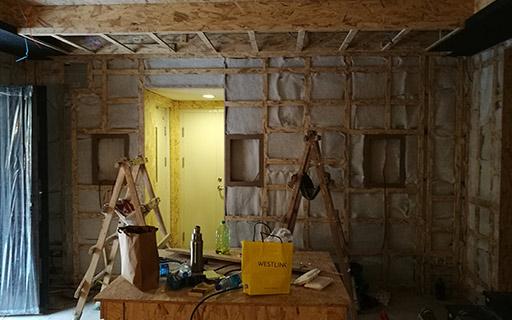 设计师在前期和业主交流当中,业主要把车库该做影音室,对于观影有着严格的要求,所以在施工前期设计师经过多次复尺以及共振测试,才确定设备摆位和声学材料布局。