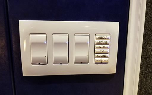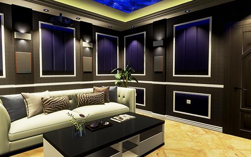 墙面和细节考虑到后,对顶部选用了吸音板加彩绘星空造型 ,因幕布后方有门所以采用了嵌入式音箱加上135寸电动透声拉线幕布,在配有中控把车库成功改成一间智能影音室。